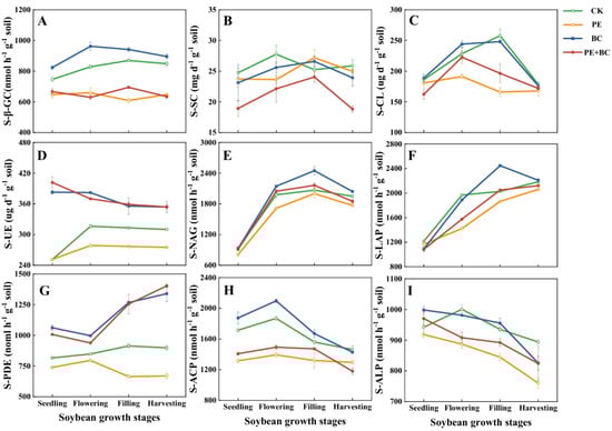 During the four soybean growth stages, PE treatments significantly decreased S-β-GC (13.3–29.9%), S-CL (2.9–35.6%), S-UE (11.2–11.9%), S-NAG (3.3–13.3%), S-LAP (3.9–27.8%), S-PDE (8.6–18.1%), S-ACP (11.5–25.5%) and S-ALP (2.6–15.0%) activities compared with CK, except for S-SC (Figure 3A–I). However, MPs addition significantly decreased S-β-GC, S-SC, S-CL, S-NAG, S-LAP, S-ACP, and S-ALP activity in biochar supplemented soil. Compared to the PE treatment, the BC treatment enhanced soil enzyme activity; for example, BC treatment increased S-UE activity by 28.7–59.7% and S-PDE activity by 14.8–87.7% (Figure 3D,G).