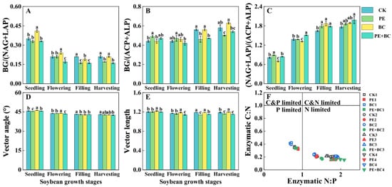 MPs and biochar effects on soil enzymatic activity ratios. (A) Enzymatic C:N stoichiometry, (B) enzymatic C:P stoichiometry, (C) enzymatic N:P stoichiometry, (D) vector angle, (E) vector length, (F) scatter plot of soil enzymatic stoichiometry showing the general pattern of microbial resource limitations. M and B denote MPs and biochar. C&P limited, co-limitation of carbon and phosphorus; C&N limited, co-limitation of carbon and nitrogen; P limited, phosphorus limitation; N limited, nitrogen limitation. Lowercase letters indicate significant differences among treatments (p < 0.05).