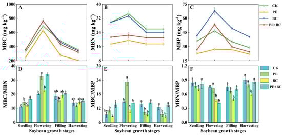 The dynamic change trend of MBC in CK, PE, BC and PE+BC was consistent; during the whole growth period, soil MBC for all treatments initially increased and then decreased, and was highest at the flowering stage (Figure 5A). The MBN in CK and BC treatments first increased and then stabilized, while in the PE and PE+BC treatments this changed steadily, in the order CK > BC > PE+BC > PE (Figure 5B). MBP exhibited a similar trend to MBC, and in the CK, BC and PE+BC treatment, this trended slightly upward and then downward (Figure 5C). The amendment of PE-MPs significantly decreased MBC, MBN and MBP content from the four distinct stages (Figure 5A–C).