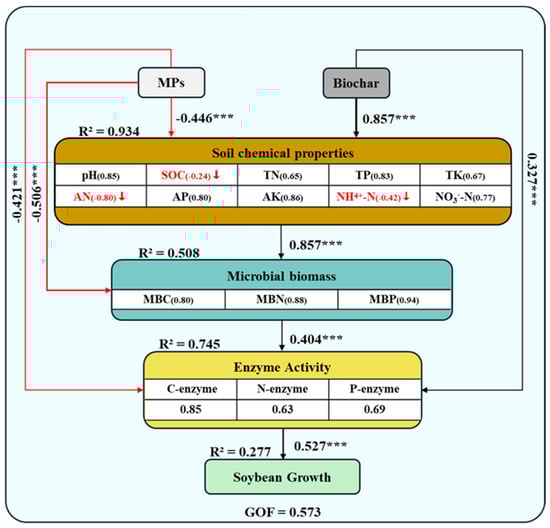Soybean growth and soil available nutrients, enzyme activity and microbial biomass were significantly correlated (p < 0.05, Figure S2). Furthermore, the available soil nutrients were affected by soil nutrient levels and PE treatments. Changes in the soil available and total nutrient contents influenced microbial biomass and enzyme activity (C, N, and P), which in turn affected soybean growth. MPs (−0.36) negatively impacted soybean growth, whereas soil biochar (0.23), soil chemical properties (0.07), microbial biomass (0.21) and enzyme activity (0.53) induced positive total impacts (Figure 6).