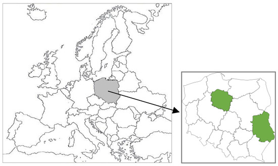 A collection of 237 soil–plant sample pairs was obtained in the spring from maize fields when the plants reached a height of 25–30 cm (BCH 14–15). Sampling points were located in moderately intensive farms in two Polish voivodeships, Kuyavian–Pomeranian Voivodeship in the north (119 samples) and Lublin Voivodeship in the east (118 samples) (Figure 1). Each soil–plant sample pair was taken from an area of 16 m2. A soil sample was created by mixing 10 subsamples taken using a soil stick to a depth of 20 cm. Soil and corresponding plant samples were taken simultaneously. The plant sample consisted of 20 maize plants cut 5 cm above ground. All of the samples were collected by trained samplers, usually one soil–plant pair from each “gmina”, the smallest administration unit in Poland.