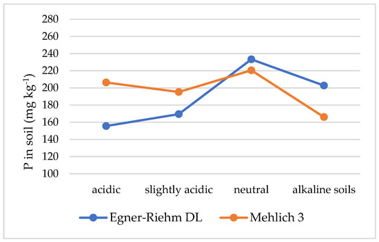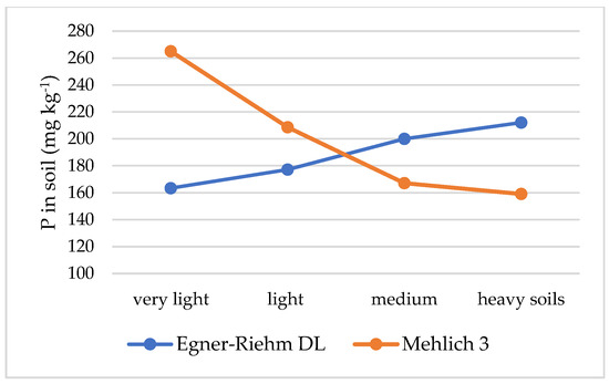 In our study, the efficiency of the tests was also compared in relation to soil texture (Figure 3). The biggest difference between M3 and DL occurred for very light soils, for which the M3 test showed 102 mg kg−1 more phosphorus than the DL test (Table 7). For light soils, the difference was much smaller at 32 mg kg−1. It is interesting to note that, for the other soils, the relationship was reversed. The DL test extracted 33 mg kg−1 more P from medium soils and 57 mg kg−1 more P from heavy soils than the M3 test.