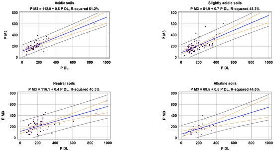 The Pearson correlation coefficients (r) between the DL and M3 tests differed depending on the soil group separated based on pH or Fr < 0.02 (Table 8). The best correlation was obtained for acidic soils (r = 0.79 ***) or medium soils (r = 0.85 ***). Regression equations for converting the test results into one another, containing only the variables PM3 and PDL and the intercept, presented too low an R2 coefficient, which indicated an unsatisfactory fit of the model to the data (in most cases R2 approx. 40%). Figure 4 shows, as an example, the simple regression equations for soil groups separated according to pH.