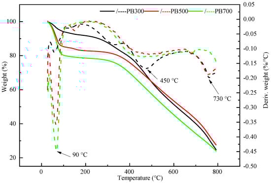 As shown in Figure 1, the weight loss process of pineapple leaf combustion is divided into three stages; moreover, when the temperature reaches 100 °C, the weight loss of biochar is about 20%. This stage mainly involves the loss of water, and the highest temperature point for weight loss is the trough point of 90 °C. At 100~600 °C, the weight of the biochar continues to decrease, and the weight loss rate at this stage is the highest at 450 °C, mainly due to the pyrolysis and volatilization of hemicellulose, cellulose, and some lignin. At 600~800 °C, we observe mainly the pyrolysis weight loss of lignin with a high stable form, and 730 °C is the temperature point of the rapid decomposition of lignin. Compared with PB300 at 400~800 °C, the weight loss of PB500 and PB700 is relatively slow, indicating that the biochar prepared at a high temperature is more stable.