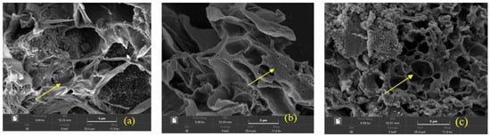 SEM images of surface pore size structure of biochar ((a) PB300; (b) PB500; (c) PB700).