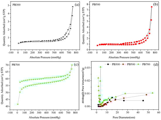 The physical and chemical properties of biochar are affected by the pyrolysis temperature and raw materials [1]. The pore size structure of biochar prepared at different temperatures is significantly different. As the pyrolysis temperature increases, the specific surface area and pore volume of biochar increase significantly [52]. The structural characteristics of the raw materials of the biochar prepared at 300 °C were still maintained, and the pore size structure did not change significantly. The biochar prepared at 500 °C had more pore structures than the biochar prepared at 300 °C. As the pyrolysis temperature increases, more volatile components in the raw material are removed, creating more space, resulting in significant changes in the surface structure of the biochar; in addition, its specific surface area increases, the pore wall becomes thinner and looser, and the overall mass becomes lower. With the increase in preparation temperature, the specific surface area and porosity of the biochar increase with the increase in temperature [53]. As the temperature increases, the pore structure in the material becomes simpler, the porosity decreases, and, therefore, the surface area per unit volume increases. The isotherms of PB700 did not close, due to the capillary condensation phenomenon that occurs at low pressure, as some micropores and minor mesopores exit [1,54].