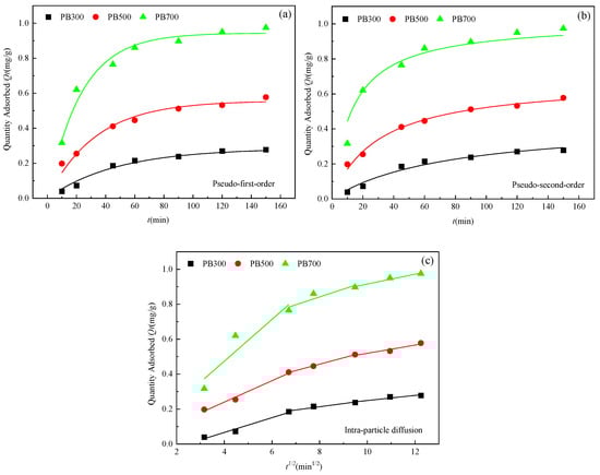 The pseudo-first-order kinetic model, pseudo-second-order kinetic model, and intra-particle diffusion model parameters were obtained. It was found that the R2 values of PB300 and PB700 were higher and more consistent with the pseudo-first-order kinetic model, indicating that the adsorption of phosphorus by the biochar was closely related to the adsorption site, while PB500 was more consistent with the pseudo-second-order kinetic model (Table 4).