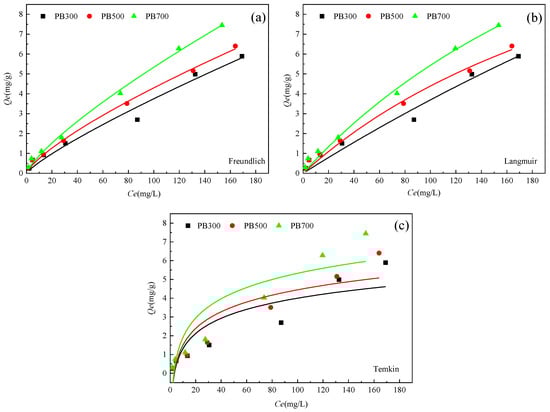 Fitting curves of phosphorus adsorption isotherm models for three biochar types ((a) Freundlich, (b) Langmuir, (c) Temkin).
