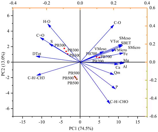 Principal component analysis and the comprehensive evaluation of the biochar properties were carried out for each factor (Table 6 and Figure 7). The results indicate that the first principal component explained 74.5% of the total variability, and the second principal component explained 13.0% of the total variability. In the first principal component, PB700 was significantly different from PB300 and PB500, and the positive contribution factors of the first principal component were mainly pore structure characteristics (SBET, VTot, et al.), Ca2+, Mg2+, Fe3+, and Al3+ content, and C-H/-CHO and C-O functional groups. The comprehensive scores of various biochar properties were PB700 > PB500 > PB300 (Table 6).