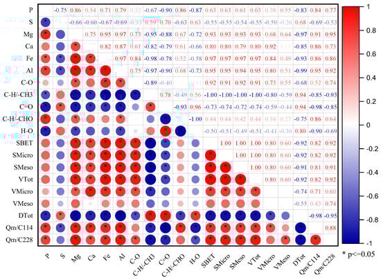 We classified the quantifiable indices in this paper into the following categories: element composition, pore structure, and functional group composition. Principal component analysis (PCA) and heat map analysis were used to cluster the various indicators and describe the correlations between them (Figure 7 and Figure 8). Positively correlated variables were grouped together, while negatively correlated variables were positioned on opposite sides of the plot origin. C-O, C-H/-CHO functional groups, Ca, Mg, Fe, Al, and SBET, and pore volume formed one cluster and played a major role in Qm. This indicated that the content of the mineral elements and the pore structure of the biochar determined the adsorption capacity of phosphorus by the biochar [16,41,50]. Shin et al. (2020) [16] prepared Mg-loaded biochar from ground coffee waste. After studying its adsorption properties for phosphorus, they found that its adsorption mechanism for phosphorus mainly included functional group action and complex precipitation. Xu et al. (2022) [43] used canna to prepare biochar at different temperatures, studied the phosphorus adsorption process of the canna biochar, and found that the phosphorus adsorption process of biochar at 700 °C included surface adsorption, intra-particle diffusion, and external liquid film diffusion. Calcium-rich crab shell biochar increased phosphorus removal from 26% to over 90% [50]. The results of phosphorus adsorption from different studies are listed in Table 6. Surface area, surface electrostatic attraction, and cation (the precipitation process) were the main factors controlling phosphorus adsorption. However, the relative content of C=O, H-O, and C-H/-CH3 functional groups decreased gradually with the decomposition of the substances. This phenomenon leads to the formation of new products or void structures [5], which indirectly affects the adsorption capacity of biochar for phosphorus. There was a significant positive correlation between Ca, Mg, Fe, Al, SBET, pore volume, and adsorption capacity (R2 > 0.71*). The results are similar to those outlined in other studies [15,58,59,60]. These results have indicated that pore structure and cation content of PB were the main factors impacting adsorption capacity.