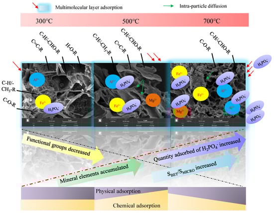 The process of the adsorption of phosphorus by PB was affected by both physical adsorption and chemisorption mechanisms (Figure 9). With the increase in temperature, the pore structure increases gradually, mineral elements accumulate, and the adsorption degree of phosphorus increases gradually [61]. This phenomenon shows that the adsorption mechanism of phosphorus by biochar prepared at high temperatures is mainly the contribution of pore size structure and the role of cation. The results of related studies also show that the adsorption capacity of Ca2+- and Mg2+ (MgO)-modified biochar of phosphate was greatly improved [15,64,65]. It can be seen that Ca2+ and Mg2+ (MgO) have a strong adsorption effect on phosphorus. The precipitation adsorption of such cations may hinder the internal diffusion of phosphate and affect the adsorption rate, resulting in the in-particle diffusion model not passing through the origin. According to the correlation coefficients (R2) of the pseudo-first-order kinetic model and the pseudo-second-order kinetic model, the different types of PB have different adsorption effects on phosphate. Specifically, the R2 values of the PB300 and PB500 biochar in the pseudo-second-order kinetic model were higher than those observed in the pseudo-first-order kinetic model, which indicates that they are more inclined to chemisorption [66]. In contrast, PB700 had a higher R2 value under the pseudo-first-order kinetic model, which means that it mainly relies on physical adsorption.