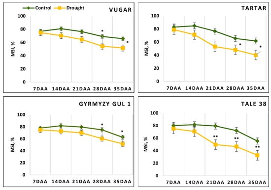 Dynamics of membrane stability index (MSI) in wheat flag leaves during natural and drought-induced senescence. DAAs—days after anthesis. Data points represent mean ± se (n = 5). Asterisks indicate significance difference (* p < 0.05; ** p < 0.01) using pairwise t tests.