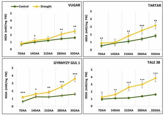An increase in the content of MDA, an indicator of lipid peroxidation, was observed in wheat genotypes during natural senescence (Figure 2). The level of MDA during drought-induced senescence was higher than the level of normal irrigation in all genotypes. This difference was more pronounced and occurred earlier in stress-sensitive genotypes. At 21 DAAs, no significant difference in MDA levels was observed between control and stressed variants of the drought-tolerant durum wheat genotype Vugar, while a 2.3-fold increase was noted in the stress-sensitive bread wheat genotype Tale 38. Towards the end of senescence, the difference in MDA content between control and drought-stressed variants became more pronounced, showing increases of 1.55-, 1.73-, 2.25-, and 2.4-fold in Vugar, Tartar, Gyrmyzy gul 1, and Tale 38, respectively.