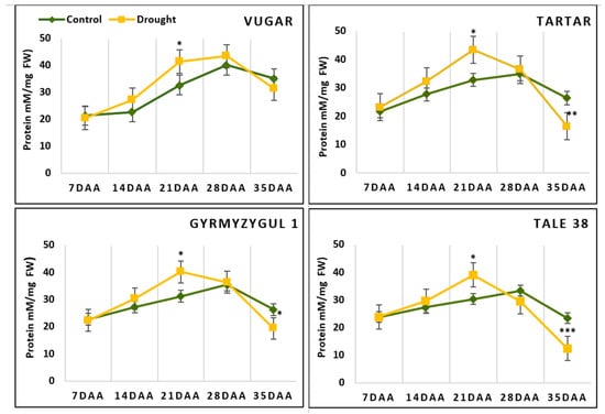 The total soluble protein content is shown in Figure 3. At 7 DAAs, no significant differences were observed between genotypes for this parameter. In naturally senescing plants, the protein content increased until 28 DAAs and then sharply decreased at 35 DAAs; in the drought-tolerant durum wheat genotype Vugar the content decreased by 12%, in the tolerant bread wheat genotype Gyrmyzy gul 1 it decreased by 25%, and in the susceptible genotypes Tartar and Tale 38 it decreased by 24% and 30%, respectively. In stressed plants, the curve reflecting soluble protein content showed changes earlier, at 21 DAAs, similar to other parameters. The only exception was Vugar, which, like the control plants, exhibited a decrease in protein content after 28 DAAs.
