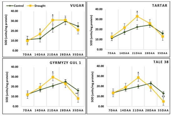 The activity of SOD during natural and stress-induced flag leaf senescence in wheat genotypes. DAAs—days after anthesis. Data points represent the mean ± se (n = 5). Asterisks indicate significance difference (* p < 0.05; ** p < 0.01;) using pairwise t tests.