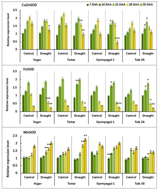 Transcript levels of CuZnSOD, FeSOD, and MnSOD in flag leaves of wheat plants during natural and stress-induced senescence. DAAs—days after anthesis. The fold change in expression was calculated using the 2−ΔΔCt method. Bars represent the mean ± se (n = 5). Asterisks indicate significance difference (* p < 0.05; ** p < 0.01; *** p < 0.001) using pairwise t tests.