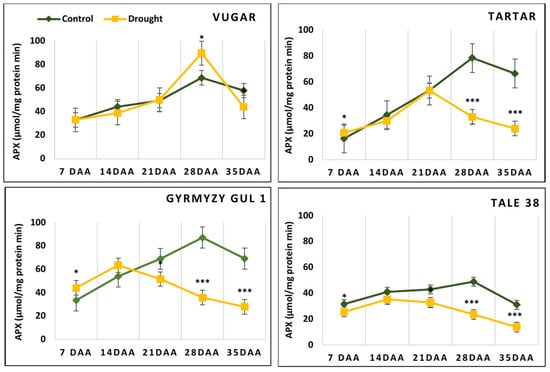 Dynamics of ascorbate peroxidase (APX) activity during natural and stress-induced flag leaf senescence in wheat genotypes. DAAs—days after anthesis. Data points represent the mean ± se (n = 5). Asterisks indicate significance difference (* p < 0.05; *** p < 0.001) using pairwise t tests.