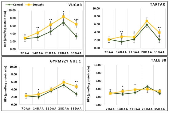 BPX activity reached a maximum in all genotypes at 28 DAAs and sharply decreased at 35 DAAs. In this stage under stressed conditions, BPX activity was higher in stressed plants compared to control plants, reaching 92%, 83%, 72%, and 17% in the Vugar, Tartar, Gyrmyzy gul 1, and Tale 38 genotypes, respectively (Figure 7).