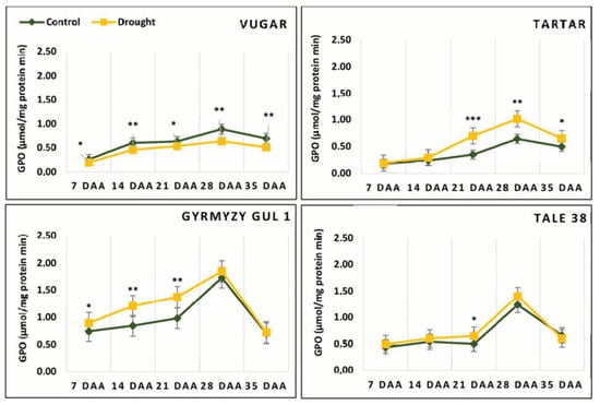 Dynamics of guaiacol peroxidase (GPX) activity during natural and stress-induced flag leaf senescence in wheat genotypes. DAAs—days after anthesis. Data points represent the mean ± se (n = 5). Asterisks indicate significance difference (* p < 0.05; ** p < 0.01; *** p < 0.001) using pairwise t tests.