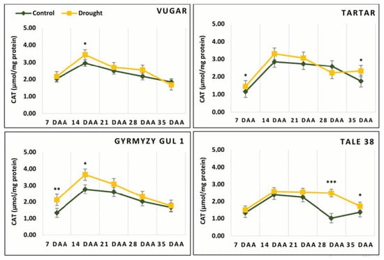 The activity of CAT during natural and stress-induced flag leaf senescence in wheat genotypes. DAAs—days after anthesis. Data points represent the mean ± se (n = 5). Asterisks indicate significance difference (* p < 0.05; ** p < 0.01; *** p < 0.001) using pairwise t tests.