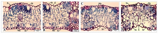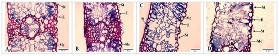 Light microscopy images of the flag leaves of the Gyrmyzy gul 1 genotype. DAAs—days after anthesis. (A)—7 DAAs under normal watering conditions; (B–D)—7, 21, and 35 DAAs under drought stress, respectively. Designations: E—epidermis; Mc—mesophyll cell; St—stomata. Semi-thin section (1 µm), one-step staining.