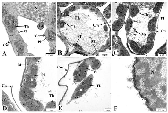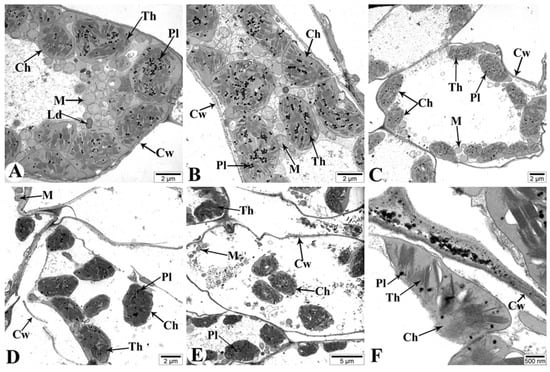 Changes in the ultrastructure of flag leaves in the Gyrmyzy gul 1 and Tale 38 genotypes during drought-induced leaf senescence were also examined using TEM (Figure 12 and Figure 13). In the control leaves of the Gyrmyzy gul 1 genotype at 7DAAs, cultivated under normal watering conditions, the ultrastructure clearly shows cell walls (Cws), chloroplasts (Chs), the central nucleus (N), lipid droplets (Lds), mitochondria (M), internal thylakoid membranes of chloroplasts (Ths), and plastoglobuli (Pl) (Figure 12A).
