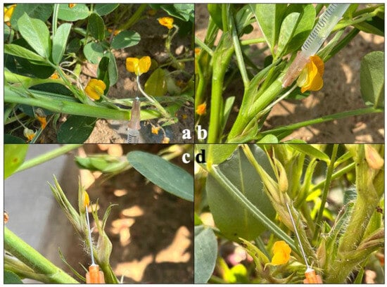 Injection of Pingyangmycin into peanut corolla (a,c) and calyx tube (b,d) on the day of anthesis (a,b) and the day before (c,d).