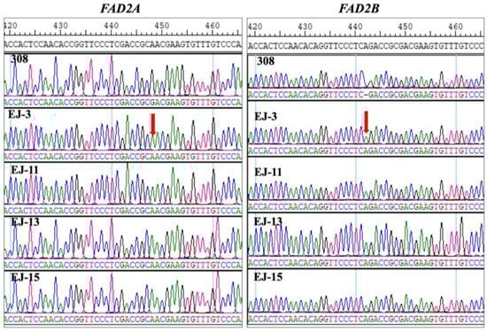 Typical F435-type FAD2 mutations (FAD2A G448A, FAD2B 442A) in high-oleic M2 seeds representing four treatments (EJ-3, EJ-11, EJ-13, EJ-15), with red arrows indicating the mutated bases.