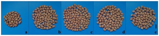 Seeds from four high-oleic M1 single plants representing four treatments (a–d) and their parent variety (308), bar size = 2 cm. (a): 308, (b): EJ-3, (c): EJ-11, (d): EJ-13, (e): EJ-15.