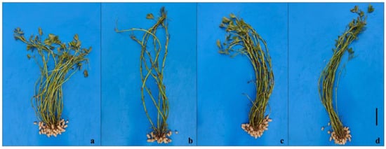 Four randomly selected high-oleic M2 plants representing four treatments (a–d), bar size = 10 cm. (a): EJ-3, (b): EJ-11, (c): EJ-13, (d): EJ-15.