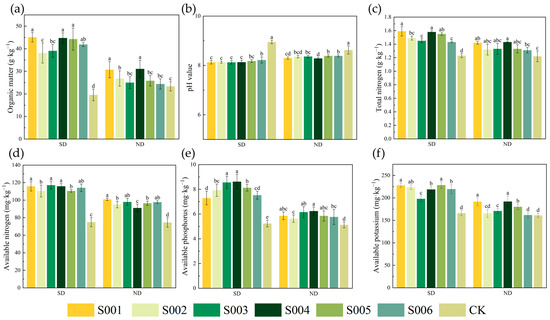 Comparative analysis of the impact of incorporating hybrid soybean on soil nutrients in 2023 and 2024. Soil samples were taken 30 days after green manure incorporation in 2023 (SD) and before the subsequent crop sowing in 2024 (ND). (a) Comparison of organic matter (SOM) content across various treatments. (b) Comparison of pH values across various treatments. (c) Comparison of total nitrogen (TN) content across various treatments. (d) Comparison of available nitrogen (AN) content across various treatments. (e) Comparison of available phosphorus (AP) content across various treatments. (f) Comparison of available potassium (AK) content across various treatments. Note: The same letters on the top of the bar are not significantly different (p > 0.05). The bars represent the standard errors (±SE) of the three replicates.