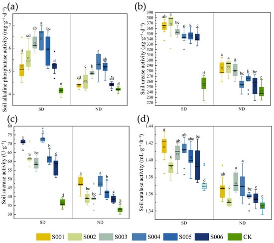 On the ND day post-green manure incorporation, S-ALP activity significantly increased in treatments S002, S003, S004, and S005 compared to CK (p < 0.05), with the largest increase observed in S004 at 26.90% (Figure 2a). There were no significant differences in S-UE activity among varieties S001, S002, and S003 (p > 0.05) but all three significantly increased S-UE activity (p < 0.05), with increases of 18.0%, 18.8%, and 16.1%, respectively (Figure 2b). S-SC activity significantly increased compared to CK (p < 0.05), with increments ranging from 16.9% to 43.2%; the overall trend was S001 > S004 > S005 > S003 > S002 > S006 (Figure 2c). S-CAT activity significantly increased in treatments S001, S003, and S004 (p < 0.05), with all showing a 2.92% increase (Figure 2d). Although enzyme activity in ND was lower than in SD, some treatments remained higher than CK, indicating a long-term positive impact of green manure incorporation on soil enzyme activity. The residual materials and improvements in the soil environment continued to sustain enzyme activity above control levels.