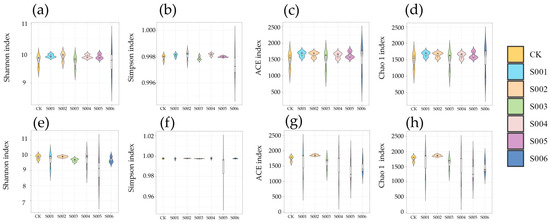 The incorporation of green manure on the SD day had a significant impact on soil bacterial diversity. Compared to the control (CK), green manure incorporation increased the Shannon index of soil bacteria by 1.42% to 1.78%. Treatments S001, S002, and S004 also increased the Simpson index, although the differences were not statistically significant. Additionally, green manure incorporation increased the ACE index and Chao 1 index of the soil bacterial community by 2.53% and 2.36%, to 13.76% and 13.54%, respectively (Figure 3a–d). This increase can be attributed to the large amount of fresh organic matter from the green manure entering the soil, providing a diverse and abundant nutrient source for various types of microorganisms. These nutrients stimulated the growth and reproduction of different soil microorganisms, leading to an increase in microbial community richness and, consequently, higher α-diversity indices.