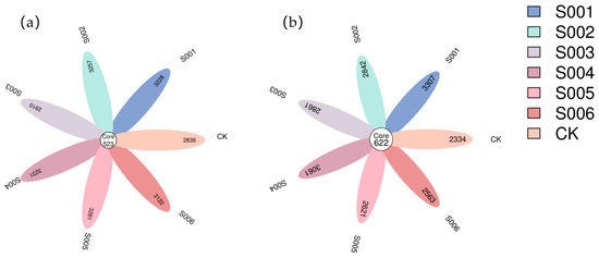 Comparative characterization of soil bacterial ASV distribution in 2023 and 2024 after green manure tillage. (a) Distribution of soil bacterial ASVs in 2023. (b) Distribution of soil bacterial ASVs in 2024. The numbers within the petals denote the quantity of ASVs.