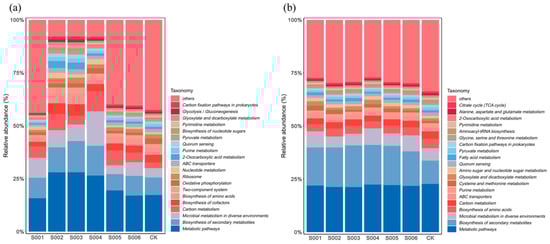 In the S002 and S003 treatments, the relative abundance of the “biosynthesis of cofactors” gene function was higher than in other groups (Figure 5a). The incorporation of green manure from the S002 and S003 varieties significantly enhanced soil microbial diversity and metabolic activity by providing rich organic matter and nutrients, improving soil structure, and creating favorable microbial habitats. These improvements activated and upregulated microbial pathways involved in cofactor biosynthesis, thereby enhancing the “biosynthesis of cofactors” function. On the SD day, among the top 20 functional genes, “metabolic pathways”, “biosynthesis of secondary metabolites”, “microbial metabolism in diverse environments”, and “others” were significantly more abundant than other functional genes. The relative abundance of “metabolic pathways” and “biosynthesis of secondary metabolites” was particularly high. In the S001 and S004 treatments, the abundance of “metabolic pathways” and “microbial metabolism in diverse environments” reached its peak. Across all six varieties of hybrid soybeans, the abundance of the “biosynthesis of secondary metabolites” function exceeded that of CK (Figure 5b). The incorporation of green manure significantly enhanced the abundance of bacterial “biosynthesis of secondary metabolites” by releasing large amounts of organic matter and nutrients, improving soil structure and aeration, and generating secondary metabolites and signaling molecules.