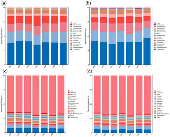 Comparative analysis of soil bacterial community composition at the phylum and genus levels. (a) Relative abundance of soil bacterial communities at the phylum level in 2023. (b) Relative abundance of soil bacterial communities at the phylum level in 2024. (c) Relative abundance of soil bacterial communities at the genus level in 2023. (d) Relative abundance of soil bacterial communities at the genus level in 2024.