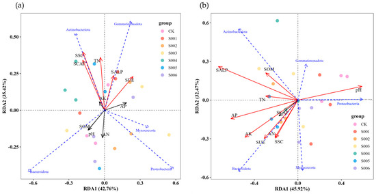 Redundancy analysis of bacterial phyla and soil environmental factors under different treatments in 2023 and 2024. Note: Panel (a) represents the bacterial phyla classification for 2023, and panel (b) represents the bacterial phyla classification for 2024. Sample groups under different environmental conditions or treatments are represented by points of different colors or shapes. Red arrows indicate environmental factors with high explanatory power, while blue dashed arrows represent species. The length of the environmental factor arrows reflects the extent of their influence on species data. Acute angles indicate positive correlations, obtuse angles indicate negative correlations, and right angles indicate no correlation. The relative influence of environmental factors on the distribution of sample communities is represented by the distance from the sample points to the projection points on the environmental factor arrows relative to the origin.