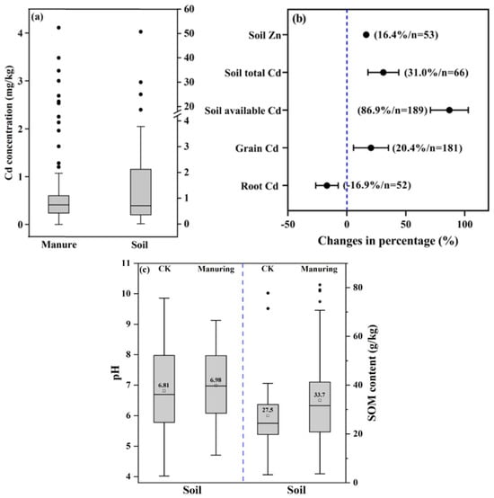 (a) Distribution of Cd contents in soil and LPM used in different studies; (b) overall changes in the impacts of soil and crop on Cd accumulation after the application of LPM, where n indicates the sample size for each category, the horizontal error line represents is the 95% CI; and (c) pH and OM content in soil in the collected dataset (CK represents control treatment, manuring represents LPM application treatment).