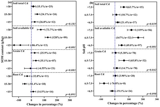 The soil SOM content did not significantly affect the soil total Cd or grain and root Cd contents after the application of LPM (Figure 4a, p > 0.05), whereas it showed a significant effect on soil available Cd content (p < 0.05). When the SOM content increased from <15 to 15–30 and >30 g/kg, the soil available Cd content changed from a decrease of 86.4% to increases of 128% and 73.7%, respectively. The results indicated that high SOM content in the soil increases soil available Cd content, and a previous study reported that soil SOM enhanced dissolved organic matter (DOM) via root secretion, which lowered the inter-root soil pH and increased the mobility of heavy metals [59]. Another study reported a low correlation between SOM content and Cd content, affecting the variation in soil available Cd contents, which was possibly an effect caused in combination with pH [58]. The soil available Cd may also be affected by interactions between other mobile heavy metals of the soil, such as the relationship between Zn and Pb. Thus, there is a need for further investigation of Cd, especially in field experiments in soils with different SOM contents [60,61].