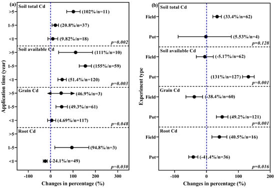 (a,b) present the impacts of duration of LPM application and different types of experiments on the changes in soil and crop Cd contents, respectively.