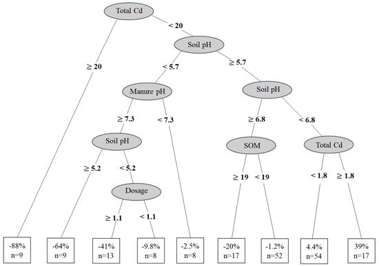 The factors influencing the accumulation of Cd in crop grains upon the application of LPM were analyzed by DT analysis (Figure 9). The results showed that soil total Cd content was the main factor affecting Cd accumulation in grains. When the Cd content was <20 mg/kg, soil pH, SOM, and LPM pH had greater effects on the grain Cd content. The application of LPM in soil with pH of <5.7 reduced the grain Cd content by 2.5% to 64%, and the Cd-reducing effect was greater when LPM had a pH of ≥7.3. In addition, the dosage of LPM had an effect on grain Cd accumulation when the soil pH was <5.2. At soil pH of ≥6.8 and SOM content of ≥19 g/kg, the application of livestock manure was not associated with any risk of Cd accumulation in grains. However, when the soil pH was between 5.7 and 6.8, the application of LPM had a risk of 4.4% to 39% of Cd accumulating on the grains, especially when the soil Cd content was >1.8 mg/kg. Overall, the factors affecting the effectiveness of LPM were as follows, in order of importance: soil total Cd > soil pH > LPM pH and SOM > dosage.