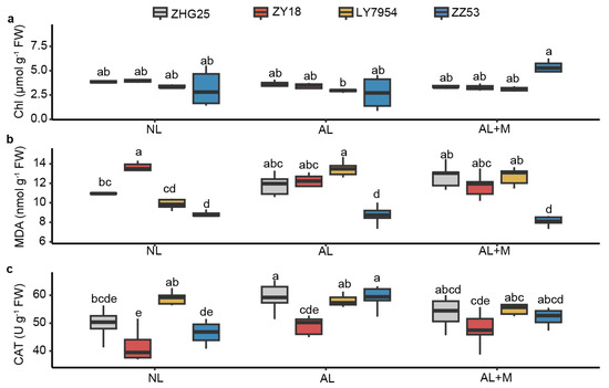 2.5. Leaf Total Chlorophyll, Malondialdehyde, and Catalase