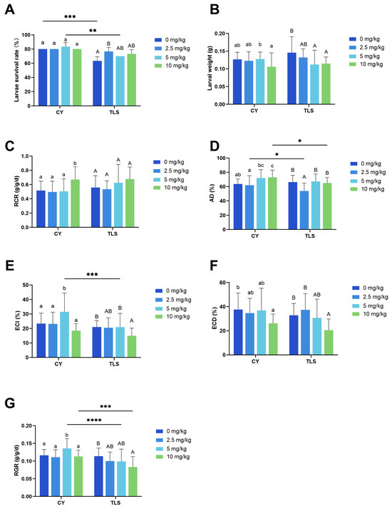 Impacts of Cd stress (0, 2.5, 5, 10 mg/kg Cd) on the growth indices and nutritional indices of S. litura larvae via Cd-treated peppers. (A) The larvae survival rate of S. litura. (B) Larval weight. (C) RCR: relative consumption rate. (D) AD: approximate digestibility. (E) ECI: efficiency of conversion of ingested food. (F) ECD: efficiency of conversion of digested food. (G) RGR: relative growth rate. Lowercase and uppercase letters indicate significant differences among treatments in the same pepper cultivar and significance levels between cultivars under Cd exposure were as follows: * p < 0.05, ** p < 0.01, *** p < 0.001, **** p < 0.0001.