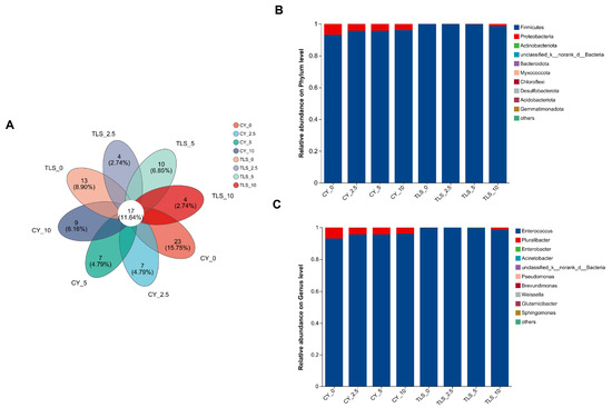 A PCoA analysis was performed on the bacterial OTUs from the 24 samples, but the results showed that, regardless of the Cd-treated peppers consumed, the larvae’s gut microbiota overlapped (Supplementary Data Figure S3). The Venn diagram displayed the common and unique OTUs across all samples, highlighting the differences in the gut microbiota of S. litura larvae after consuming leaves from two pepper cultivars treated with different concentrations of Cd (Figure 2A). At the OTU level, 17 OTUs were shared across all treatments. In the CY group, the number of unique OTUs of 0, 2.5, 5, and 10 mg/kg Cd was 23, 7, 7, and 9, respectively. In the TLS group, the number of unique OTUs of 0, 2.5, 5, and 10 mg/kg Cd was 13, 4, 10, and 4, respectively. The detailed similarities and overlaps of bacteria at other taxonomic levels (phylum, class, order, family, genus, and species) in all of the treatments are shown in Supplementary Data Figure S4.