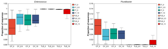 Besides evaluating relative OTU abundance, we examined the differences in the total abundance of the two most dominant symbiotic bacteria, Enterococcus and Pluralibacter (Figure 3). We found that regardless of whether the larvae fed on Cd-contaminated CY or TLS, the abundance of Enterococcus was the highest, with no differences between concentrations and cultivars. However, when feeding on CY, the abundance of Pluralibacter was the highest in the control. The difference was not statistically significant, although it decreased during the Cd-contaminated CY treatment. Compared to CY, the abundance of Pluralibacter in the larvae feeding on TLS was reduced but in all Cd treatments, the abundance of Pluralibacter was higher than the control, with the highest being in the 10 mg/kg Cd treatment.
