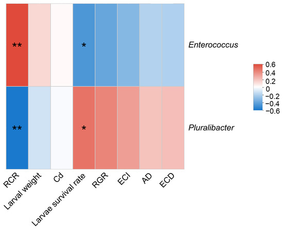 Pearson correlation analysis was conducted between the dominant bacterial species in S. litura larvae under Cd stress and larval life traits (RCR, AD, ECI, ECD, RGR, larvae survival rate, and larval weight) and leaf Cd concentration. (Figure 4). Enterococcus was significantly positively correlated with the RCR of larvae but negatively correlated with survival rate, while Pluralibacter demonstrated a significant negative correlation with RCR and a significant positive correlation with survival rate.