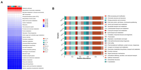 Predicted gut microbiota functional groups in S. litura larvae via Cd-treated peppers. (A) Heatmap of predicted KEGG pathways. (B) Relative abundances of predicted COG functions for bacteria in S. litura larvae via Cd-treated peppers.