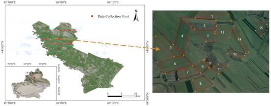 The experimental area was situated in the farmland region surrounding the 147th Regiment of the Eighth Division of the Xinjiang Production and Construction Corps (85°53′–86°40′ E, 44°36′–44°43′ N) (Figure 1). The average elevation in the area is 354.1 m, and this region has a temperate continental climate. In this study, 15 uncultivated plots of farmland were randomly selected, with areas ranging from 41,126.66 to 440,773.33 m2. The latitude and longitude coordinates of the four corner points of each plot were obtained.