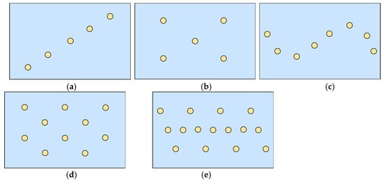Schematic diagram of different multipoint mixed sampling methods (The yellow dots represent the sampling points): (a) diagonal method; (b) plum blossom method; (c) S-shaped method; (d) checkerboard method; (e) zigzag method.