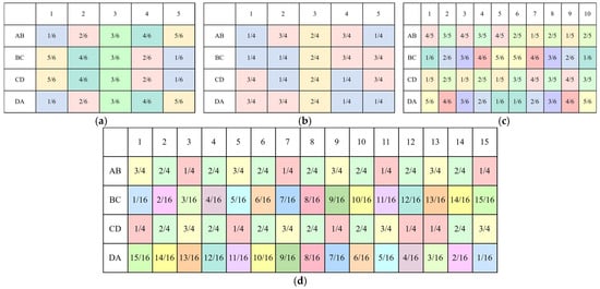 In this study, the design approaches for the diagonal method, plum blossom method, checkerboard method, and zigzag method were identical. The corner points of individual rectangular sampling units were designated A, B, C, and D in a clockwise direction. On the basis of the shape characteristics of the units in the four sampling methods, a relational matrix illustrating the connections between the sampling points and plot boundaries was developed (Figure 3). In this diagram, Arabic numerals 1 through 15 represent different sampling points, whereas AB, BC, CD, and DA indicate the four edges of the rectangle. The data in the matrix diagram indicate that after dividing each of the four sides of the quadrilateral into a corresponding number of equal parts, the resulting equidistant points were connected to the starting points of the sides on which they were located, forming a line segment. The equidistant point at which this line segment displayed a specific proportional relationship to the length of the associated side was then chosen and connected to the corresponding equidistant point on the opposite side of the quadrilateral; the resulting intersection point was selected as the sampling point, and the start and end points of each quadrilateral side were determined in a clockwise direction.